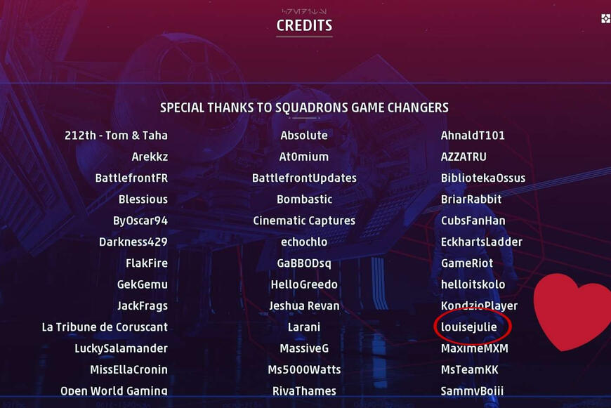 I was featured in the credits of Star Wars Squadrons after I was invited to be part of the EA Creator Network (formally EA Game Changers)!